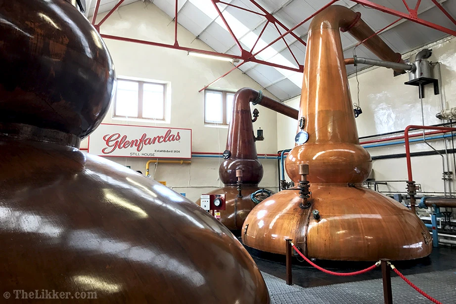 Τρία ζευγάρια χάλκινοι άμβυκες δεσπόζουν στην αίθουσα και δεν το λέμε για υπερβολή. Οι wash stills του Glenfarclas είναι οι μεγαλύτεροι στο Speyside, με παραγωγή 26.500 λίτρα. Και οι spirit stills δεν πάνε πίσω όμως, με παραγωγή 21.200 λίτρα. Όλοι οι άμβυκες θερμαίνονται απ’ ευθείας ο καθένας (direct heat), όπως δηλαδή στην παραδοσιακή μέθοδος απόσταξης. Το Glenfarclas είναι το μοναδικό αποστακτήριο που χρησιμοποιεί ακόμα αυτή τη μέθοδο. Να σημειώσουμε εδώ ότι υπάρχουν δύο τρόποι θέρμανσης. Με ατμό, όπου νερό βράζει μέσα στον άμβυκα, αλλά σε διαφορετικό διαμέρισμα από το υλικό μας και αυτός ο ατμός τον θερμαίνει και direct fire, όπου με γκάζι θερμαίνεται ο άμβυκας από κάτω. Η επιλογή διατηρήθηκε από την οικογένεια διότι το 1981, που υιοθέτησαν και οι ίδιοι τη μέθοδο με τον ατμό, δεν έμειναν ευχαριστημένοι από το αποτέλεσμα. Η άποψή τους είναι ότι χρειάζεται ένα πλούσιο απόσταγμα για να αντιμετωπίσει τις τανίνες και τα ώριμα φρούτα των βαρελιών sherry και με την απ’ ευθείας θέρμανση πετυχαίνουν το ιδανικό first spirit.